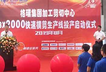 2019-08-192019年08月16日上午,格瑞集團加工中心3*2米快速開平線投產開機儀式在加工中心車間隆重召開,格瑞集團總經理助理馮國棟宣布儀式開始,龐宏董事長發表講話并致辭。